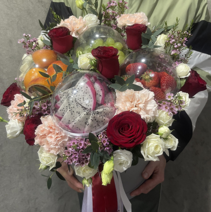 Эксклюзивная композиция – коробку с цветами и фруктами от DeLaFlor. Этот уникальный подарок сочетает в себе нежность свежих цветов и сочность отборных фруктов, создавая незабываемое впечатление.