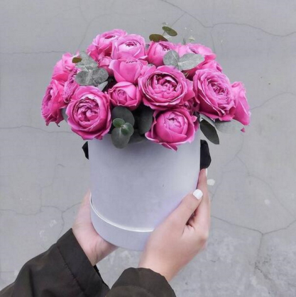 Коробка с эвкалиптом и пионовидными розами Мисти Баблс | Купить в Новосибирске