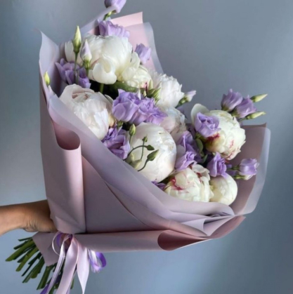 Утонченное сочетание нежности и изящества. Пышные белоснежные пионы гармонично дополняются элегантной эустомой с нежно-сиреневыми лепестками, создавая воздушную и романтичную композицию. Такой букет станет прекрасным украшением любого праздника, подойдет для поздравлений, выражения благодарности или просто для того, чтобы порадовать близкого человека. Идеальный выбор для тех, кто ценит стиль, свежесть и природную красоту!